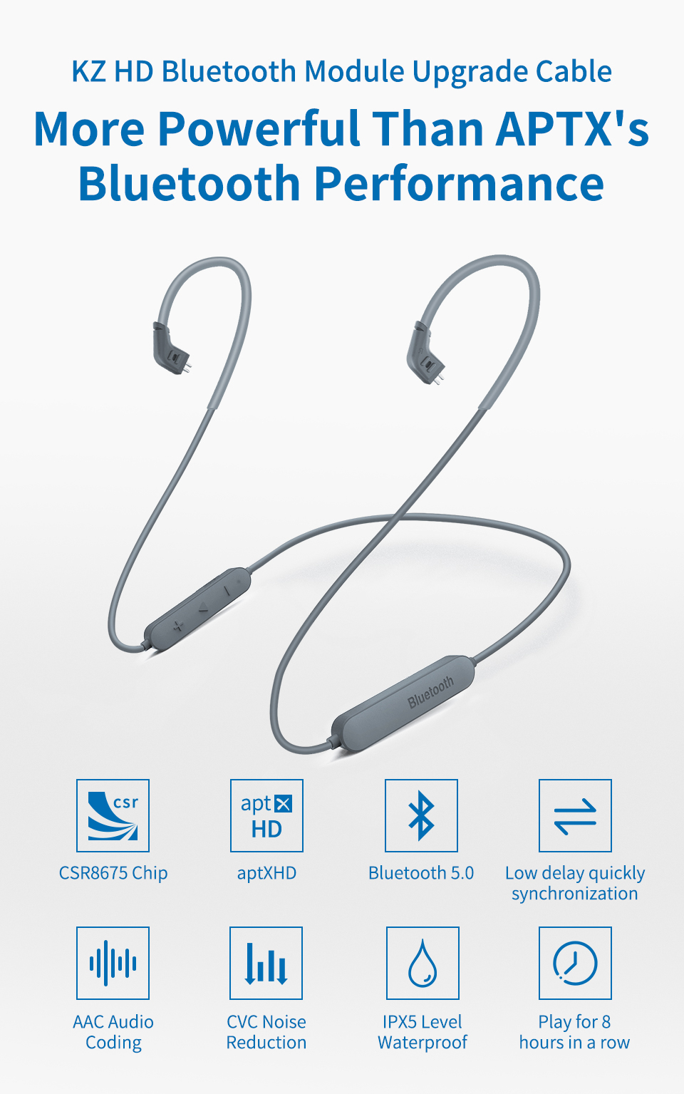 KZ aptX-HD (Qualcomm Bluetooth Wireless) upgrade plug-on wire, IPX5 water proof (anti sweat), Hifi audio aptX-HD lossless audio, with mic (C-pin)