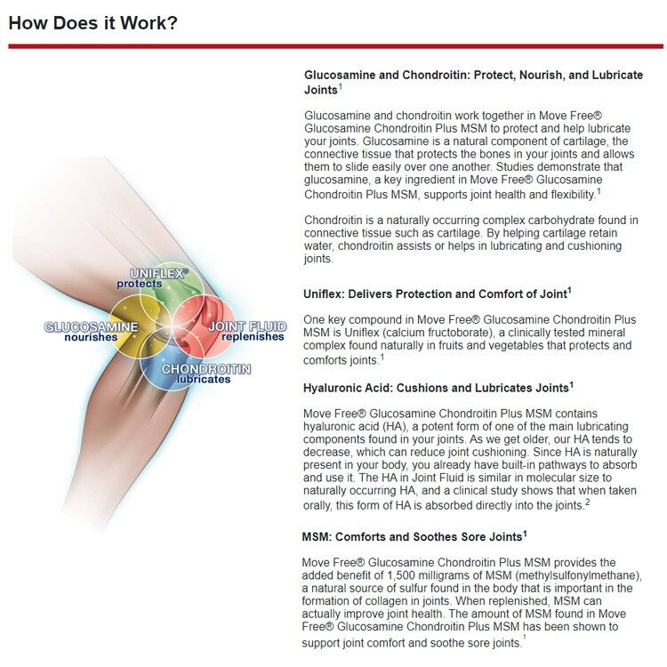 Move Free Advanced + MSM is a Glucosamine Chondroitin joint supplement that supports 5 signs of joint health (mobility, flexibility, strength, lubrication and comfort) and provides extra cartilage support so you can do the things you love. Glucosamine is key for the formation of cartilage, an essential building block of your joints to support your mobility and flexibility. Chondroitin is a building block of cartilage that supports joint strength by helping to resist compression in the joint. In the body, Chondroitin functions by attracting fluid to joints to support cushioning and lubrication. Uniflex® (FruiteX-B® Calcium Fructoborate) is a clinically tested mineral complex that supports joint comfort in as little as 2 weeks1. Hyaluronic Acid (HA) is the same molecule found in healthy joint fluid. HA has been reported to support joint lubrication and smooth movement. As we get older, levels of HA tend to decrease. Methylsulfonylmethane (MSM) is a source of sulfur found in the body that is important in the formation of collagen in joints, collagen is a vital part of your joints because it supports the structure of cartilage.*