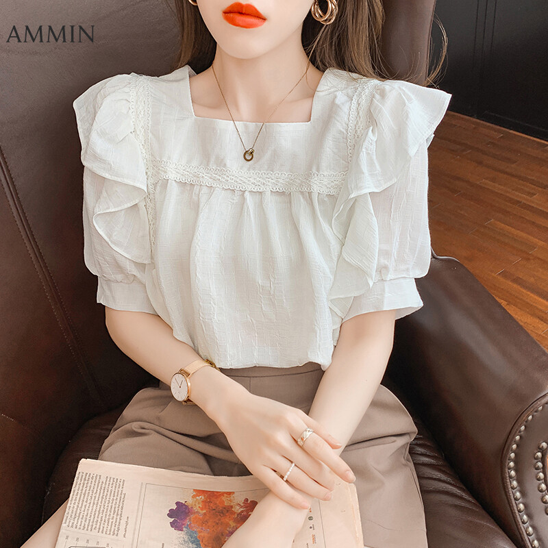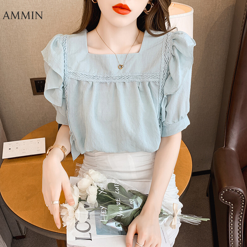AMMIN Tops 2021 summer new style square neck puff sleeve embroidery hollow lace stitching blouse women's elegant temperament personality design French loose pleated ruffle stitching short style chiffo