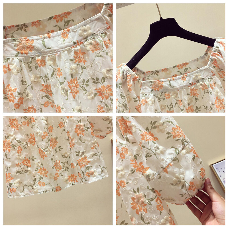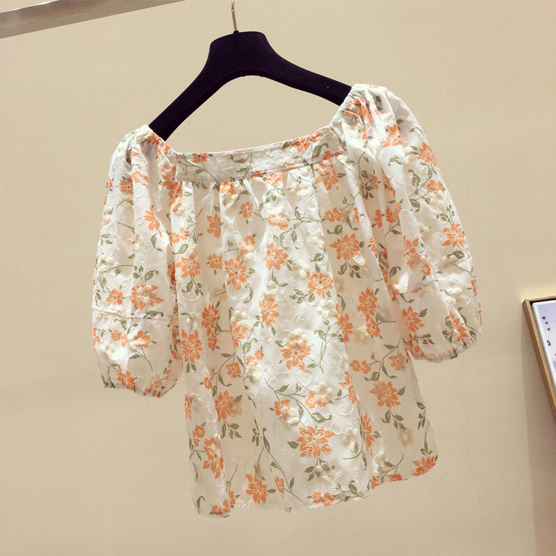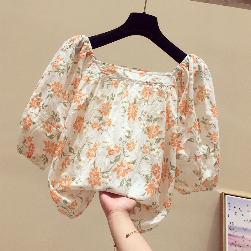 AFEG new Korean style square neck fashion loose wild floral short-sleeved blouse for women