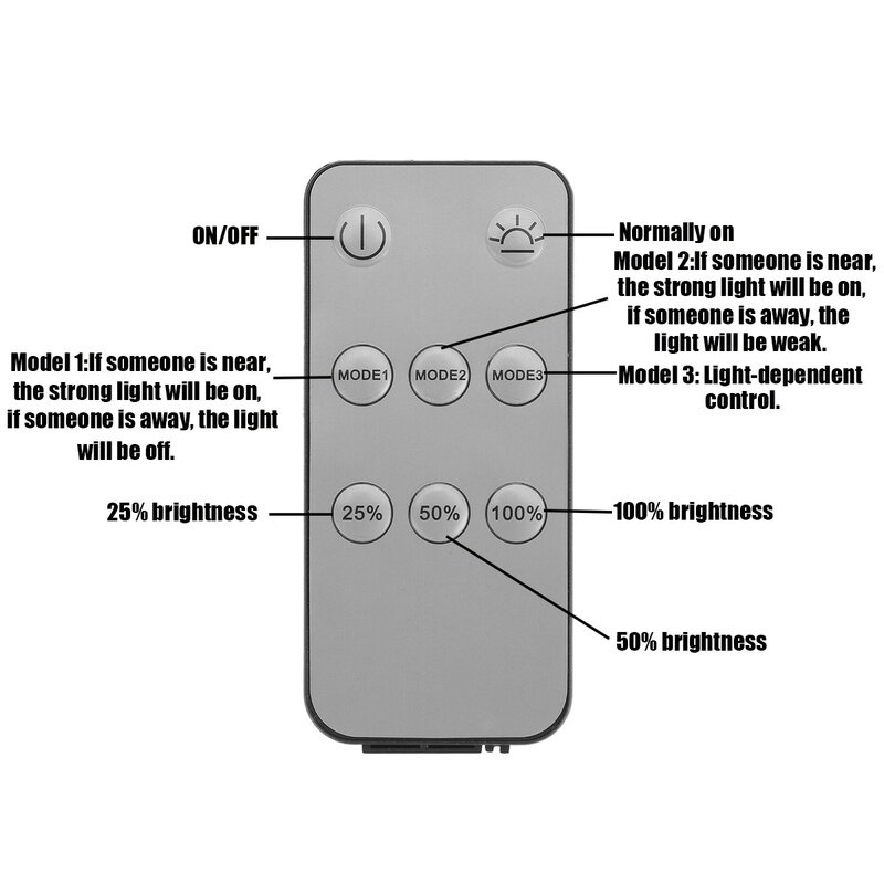 Hi my friends. Here is my most detailed description of the product, I hope it will be helpful to your purchase. 1. Waterproof and wide application: IP65 waterproof, it can also be used in rainy days. Suitable for home, outdoor, outdoor, decorative lighting, camping, terraces, umbrellas, sheds, umbrellas, pavilions, trees, terraces, gardens, etc. 2. Solar charging, automatic working time is long: in the daytime, under the action of solar heat collector, it works by using the built-in lithium battery to store electric energy. It will automatically light up in the dark and dim at sunrise. With remote control, easy to use. The smart outdoor solar light can emit soft and warm light for more than 18 hours after being fully charged. Specifications: --Solar Pane: 1.5W 5.5V --Working Mode: Normally On --Led: 30pcs SMD 2835 --Lampshade Material: PC --Led Light Color: White --Shell Material: PC+ABS --Output Rate: 1.8W --Waterproof: IP65 --Lumens: 400lm --working mode:automatically light on at night until the power is off Warm Tips: The solar light is light control, automatically turn off and charging at daytime, if you want it work at daytime, you need to use something to cover the solar panel,the efficiency of the solar panel depends on the weather, the strong sunshine it has, the better efficiency it will be, the efficiency of the solar panel will be weakened on cloudy day, the longer sunshine it has, the working time will be longer. Package Included: 1x Solar Light (1 head/2head) 1x Remote control 1x accessories 1/2/3/4*100LED solar light Thank you for you watching.Brand new product, brand new experience.Hope it can help your life!!