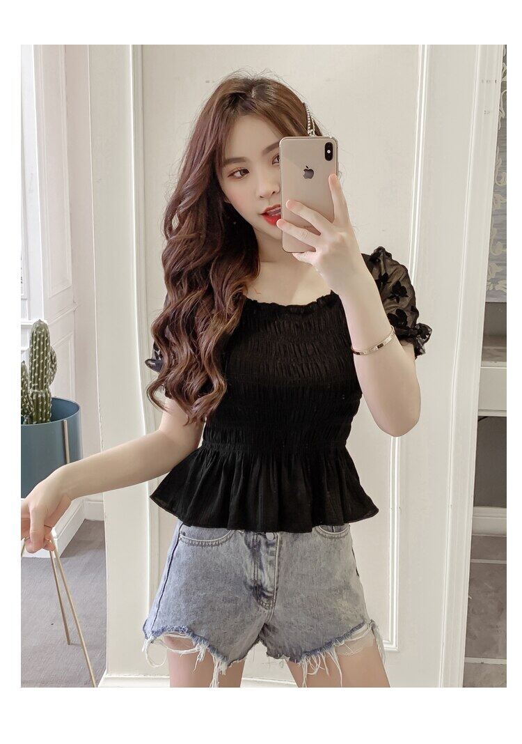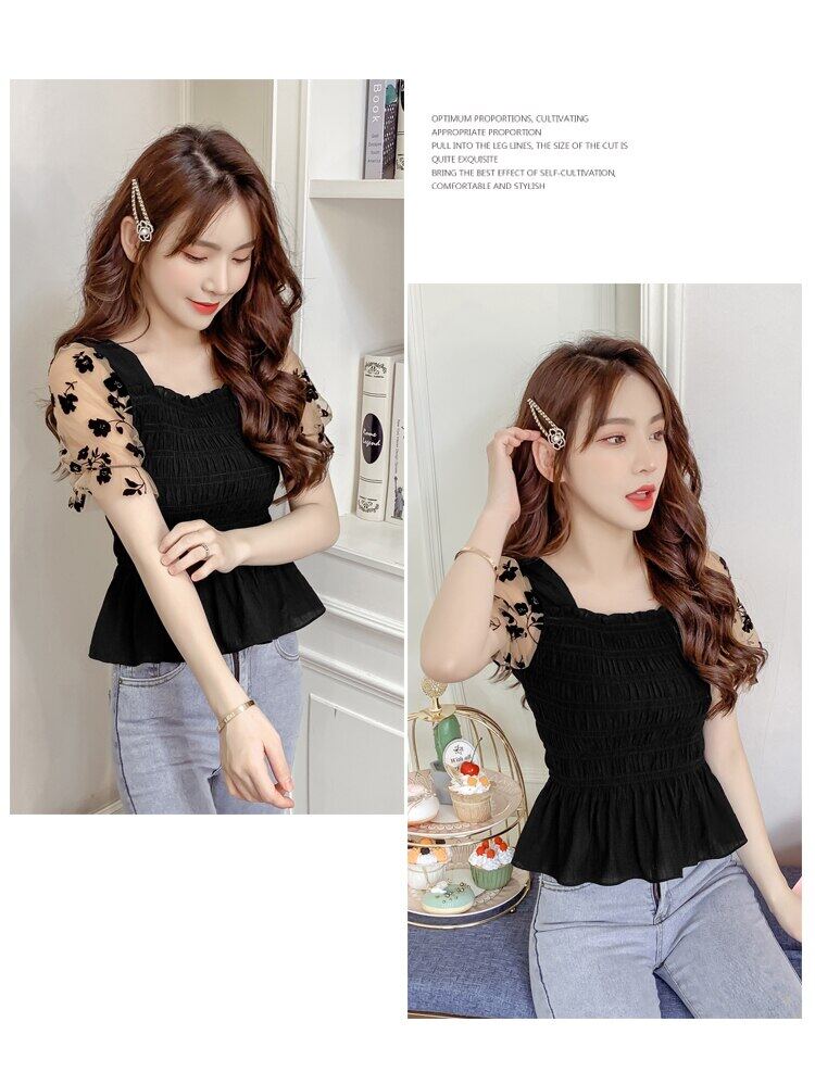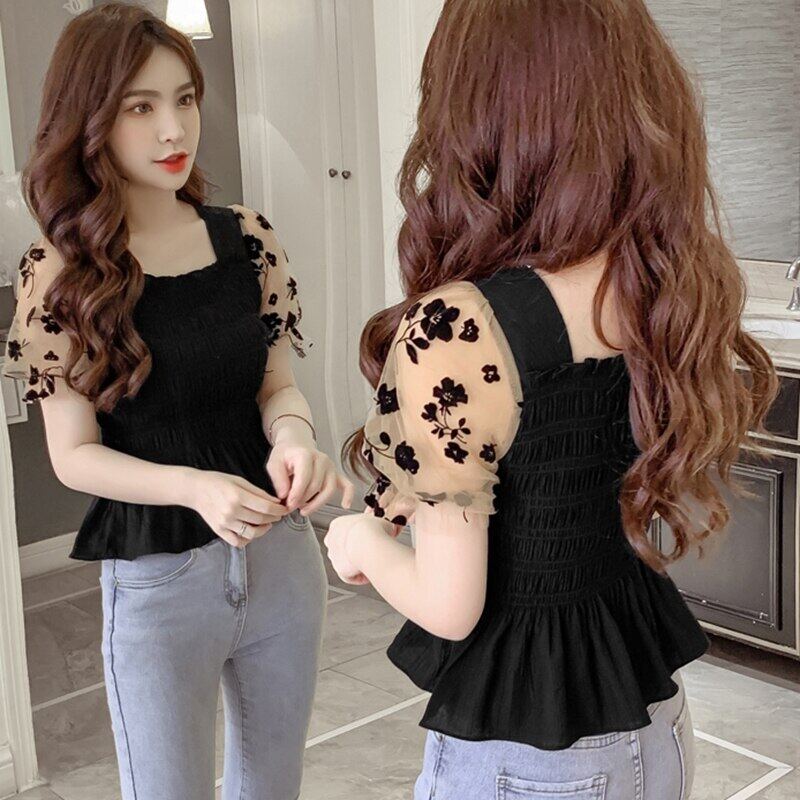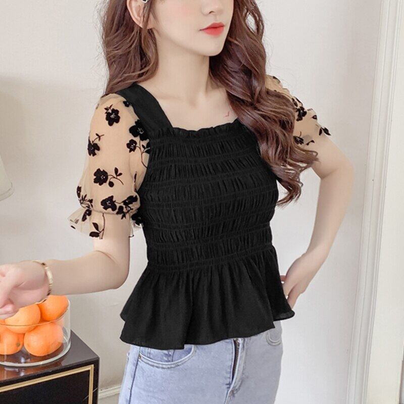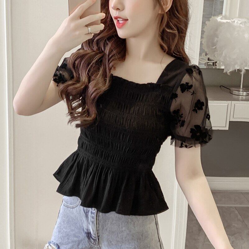 Blouse Korean Style Women NEW Summer Short Mesh Puff Sleeve Ladies Solid Color Elasticity Chiffon Blouses Square Neck Female Tops