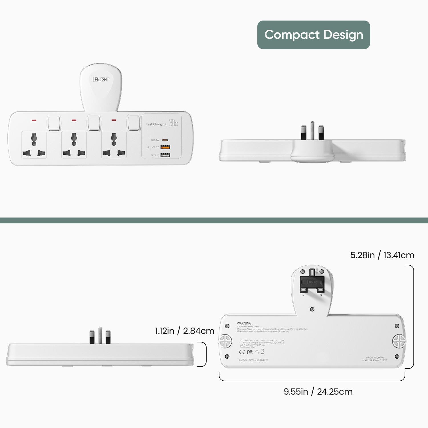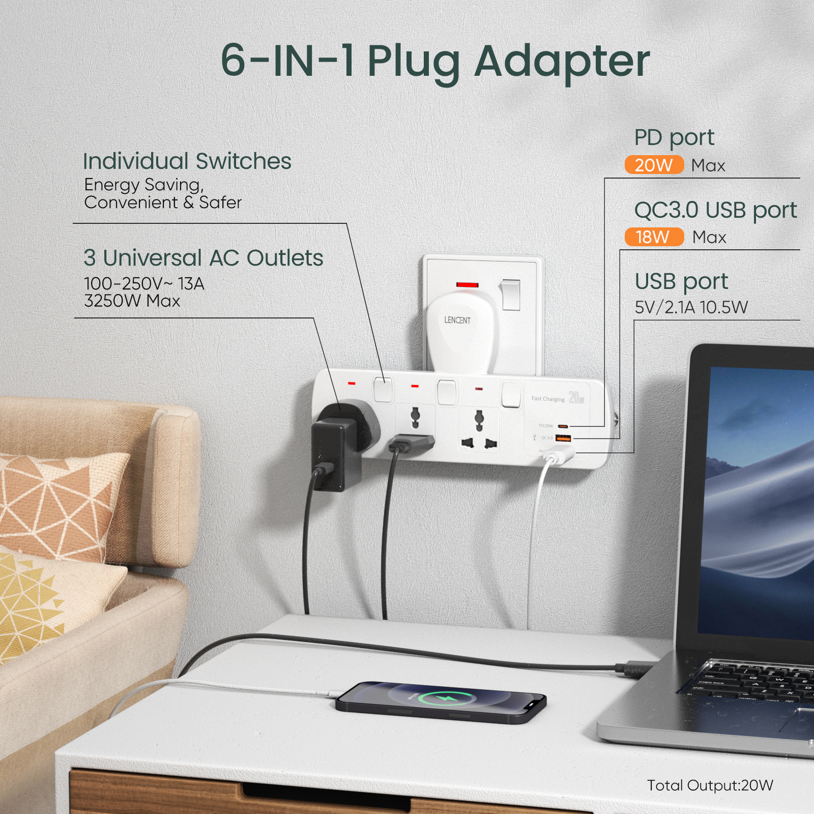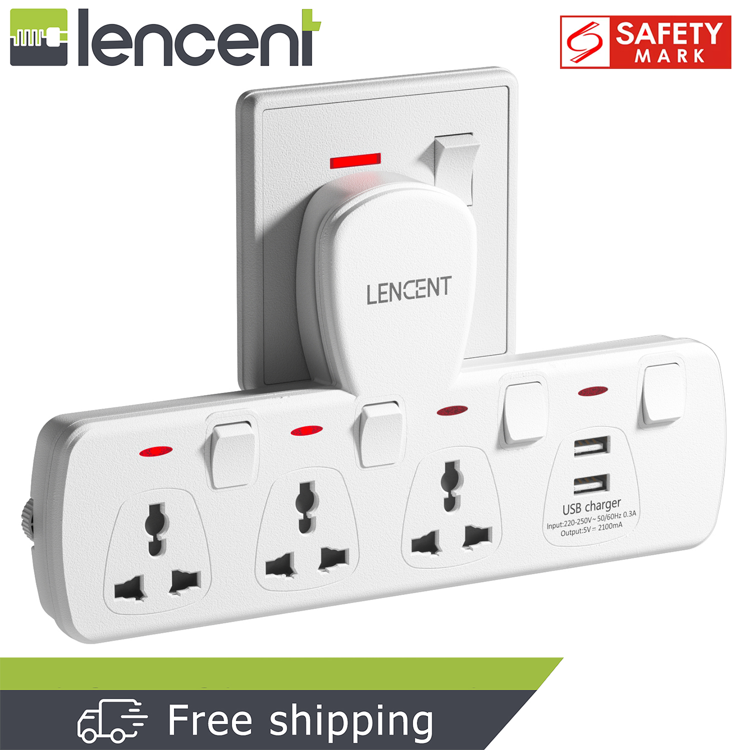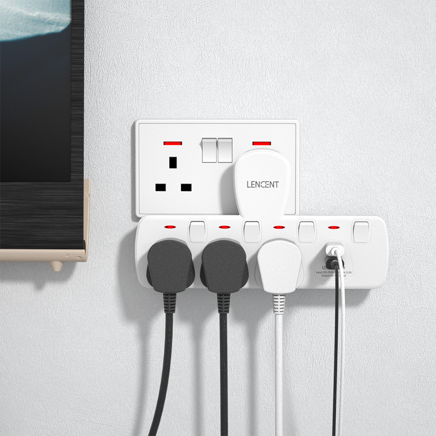 Lencent 5 in 1 Extension Plug USB Wall Plug with Individual Switches, 3 Outlets with 2 USB Ports, Multi Plug Outlet, 5V 2.1A USB Power Plug Adapter, Multiple Socket Charger Extension for Home, Office,