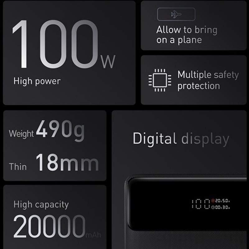 MTech Power BASEUS 100W Type C PowerBank Power Bank Blade Series Plane Friendly 20000mAh Fast Charging LED Display Power Bank For Laptop Macbook Tablets Phone