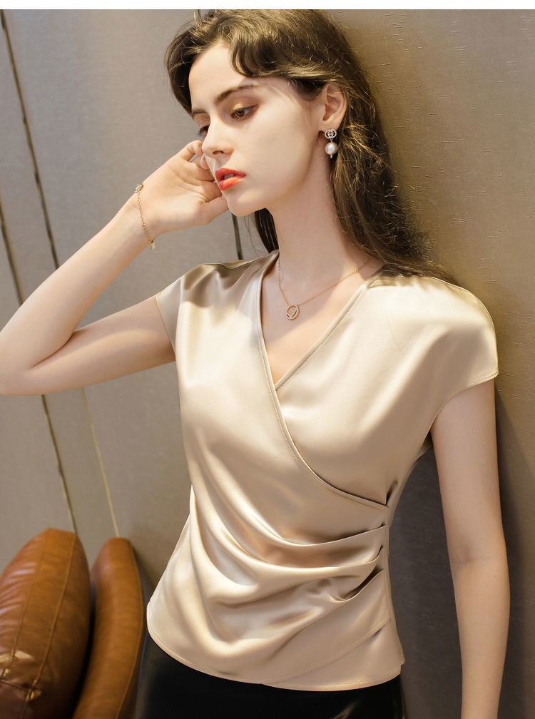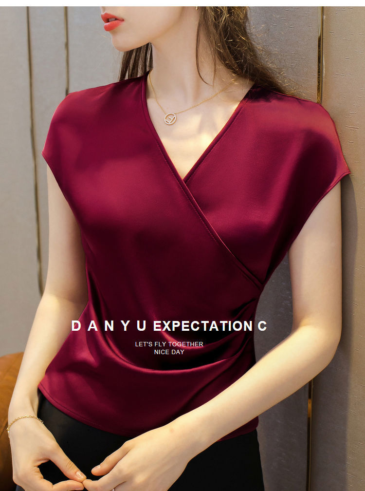 EDQRDQ Women's Casual Satin Silk Cross V Neck Wrap Tee Ruched Fold Shirt Elegant bishop Sleeve Blouse