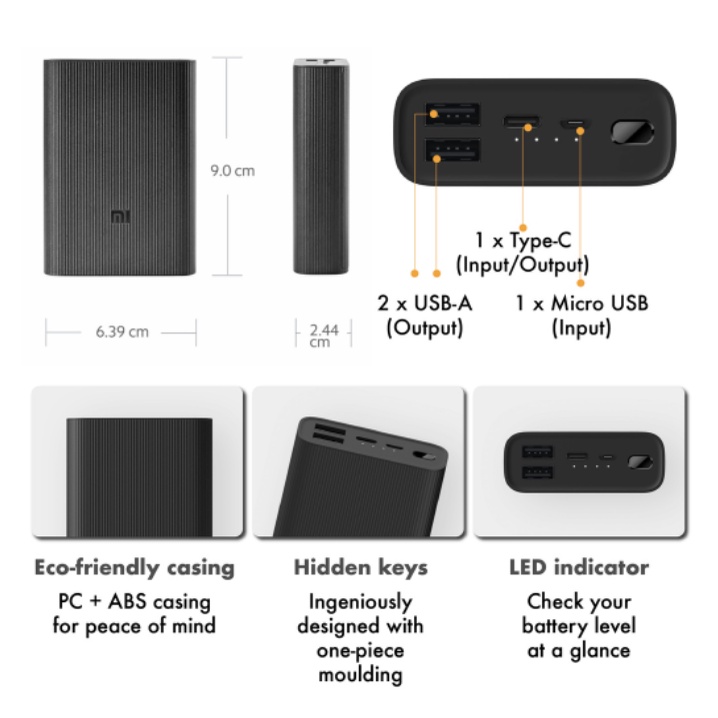 Port: 1X USB-C (Input/Output) ; 1X Mico USB(Input); 2x USB-A (Output)