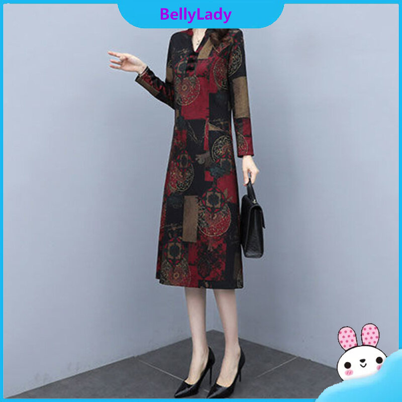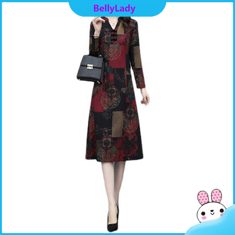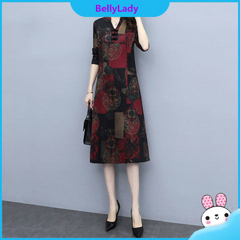 Women V Neck Dress Stylish Retro Printing Long Sleeves Large Size Loose Casual Dress