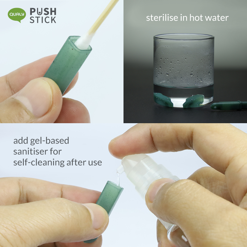 Push stick can be sanitised with hot water; add gel-based sanitiser in cap forself-sanitising function